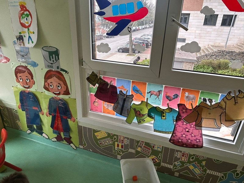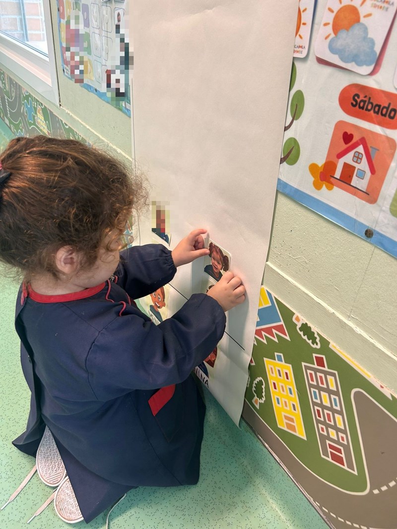 Na sala, foi colocada a representação da cara de um menino e de uma menina, cujas partes — olhos, nariz, boca e orelhas — podem ser retiradas e novamente colocadas, permitindo às crianças montar e reconstruir o “rosto”. O entusiasmo dos nossos meninos e meninas foi imediato, pelo que decidimos alargar a proposta, acrescentando o restante corpo e diferentes peças de roupa para exploração.