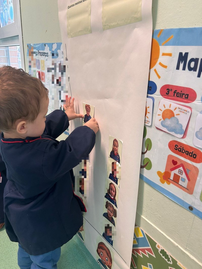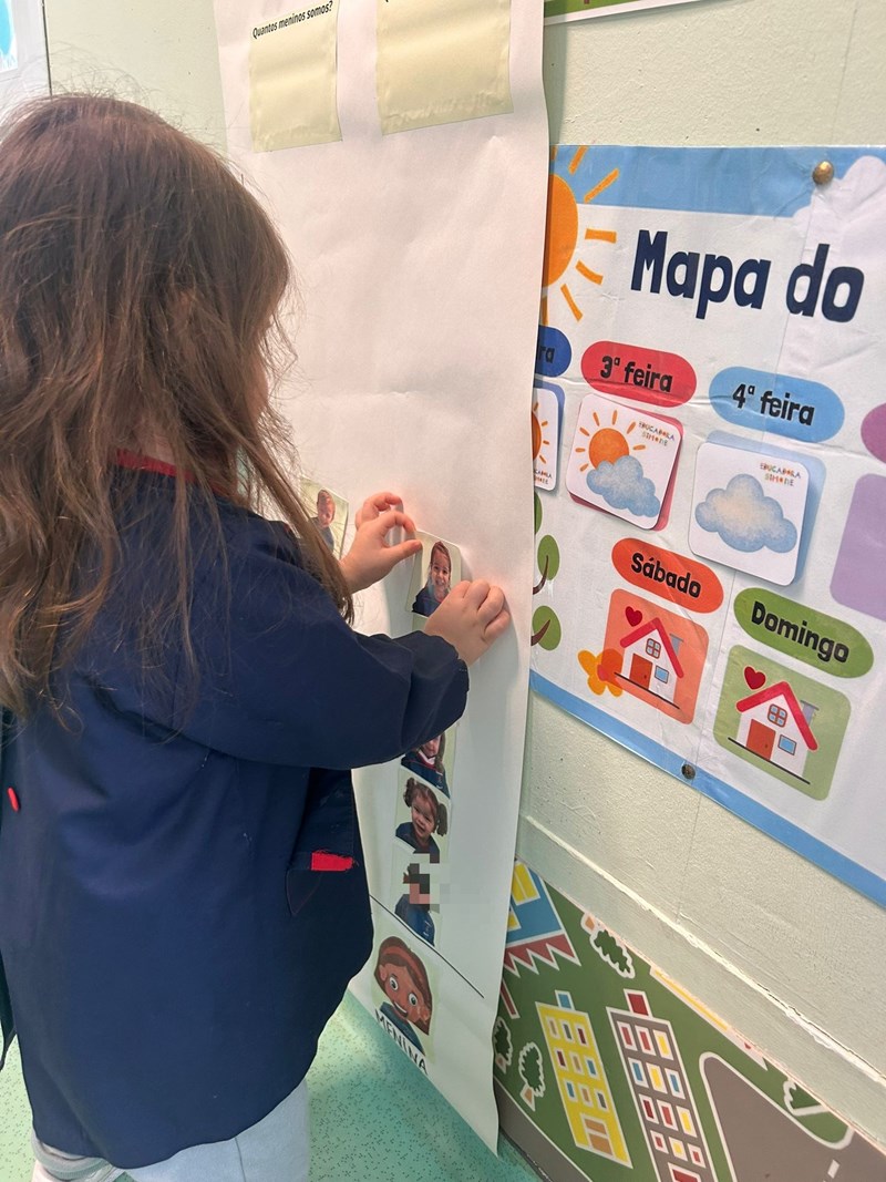 Na sequência destas descobertas e representações, as crianças começaram a distinguir o género e, progressivamente, a identificar-se com essas mesmas representações. Aproveitando este interesse, construímos em conjunto um pictograma, no qual cada aluno selecionou o género com o qual se identifica.