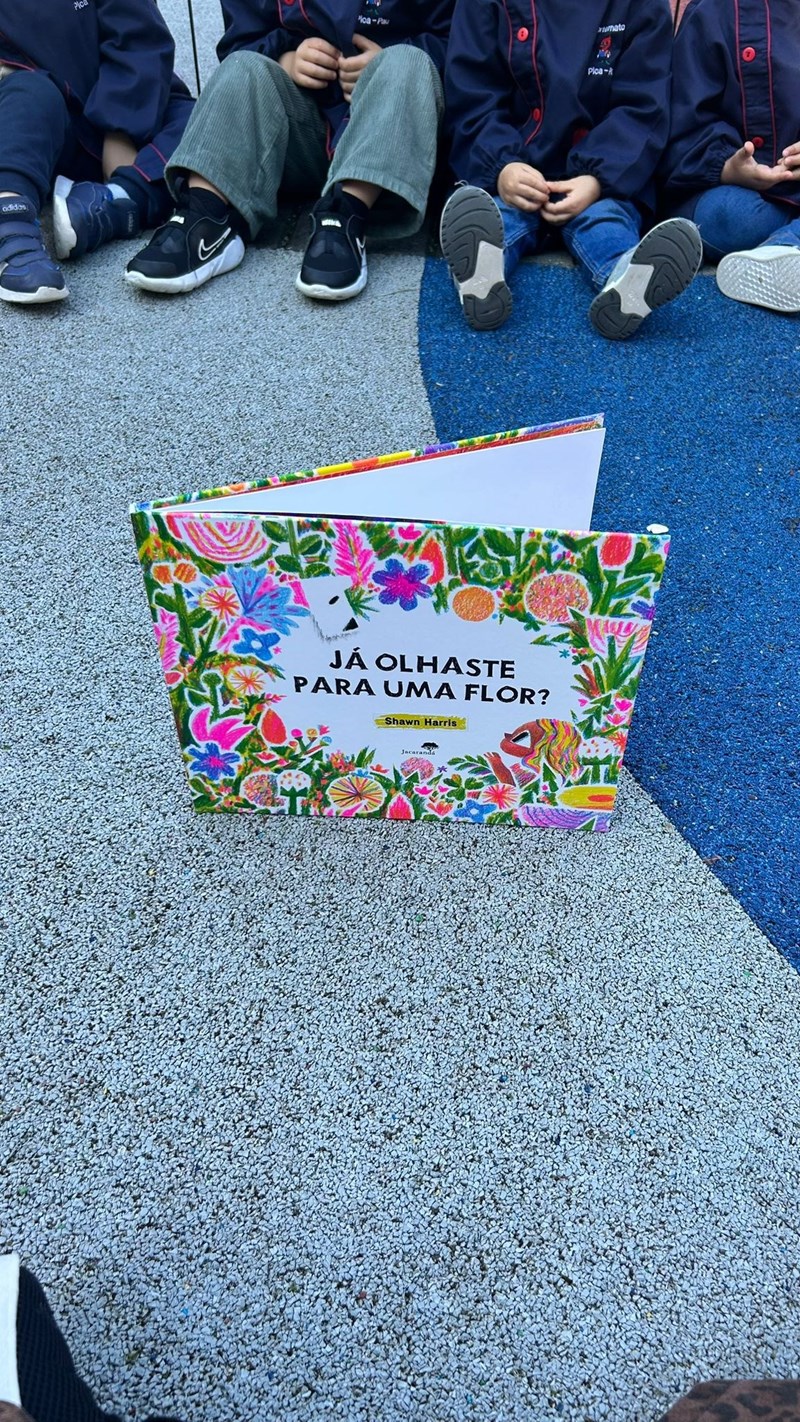 A atividade iniciou-se com a leitura de uma história alusiva à Primavera, realizada ao ar livre, num ambiente tranquilo e inspirador. Este momento permitiu às crianças explorar os sons, as cores e os cheiros da natureza, tornando a experiência da leitura ainda mais rica e significativa.