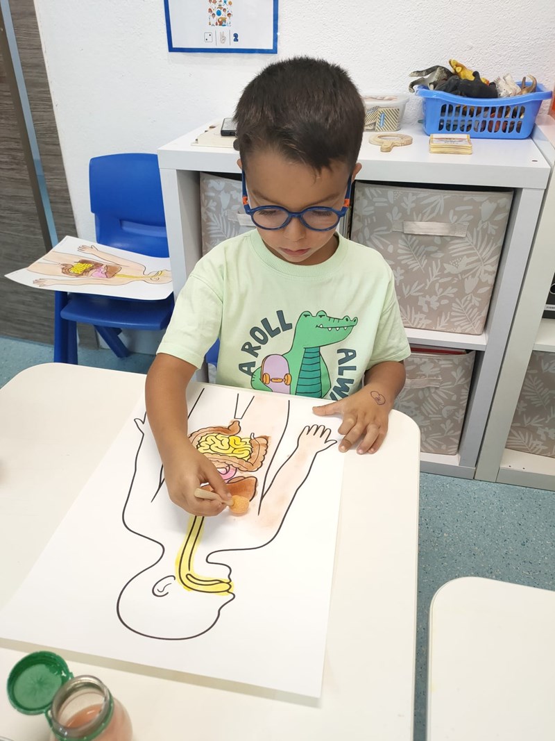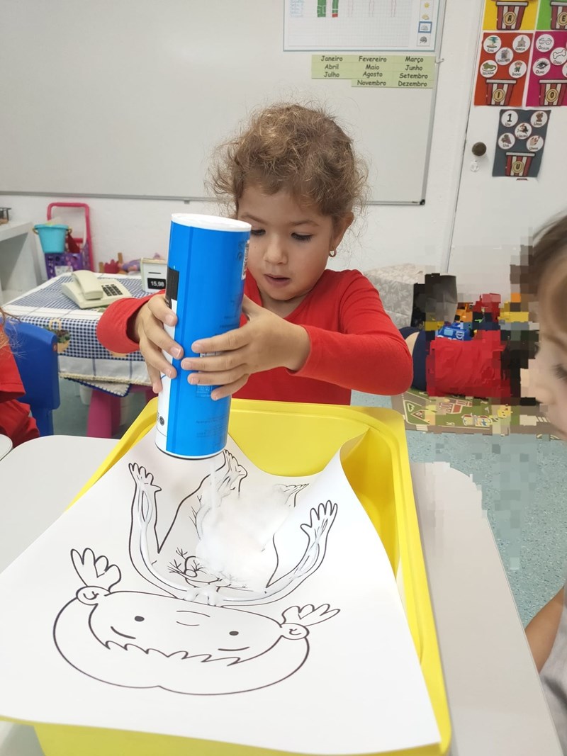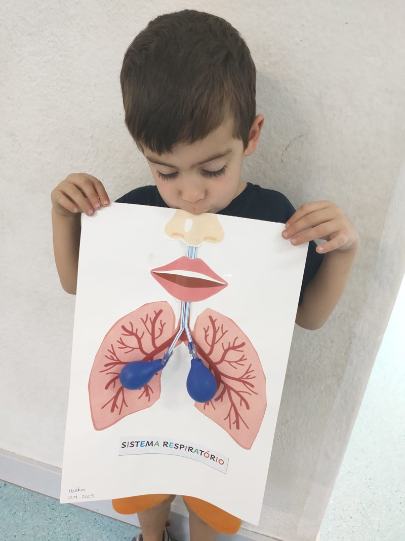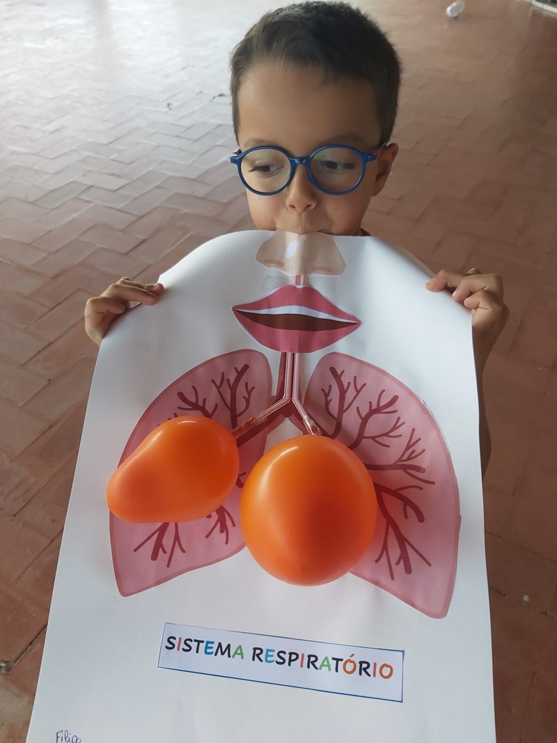 Neste contexto, os nossos pequenos cientistas realizaram diversas atividades sobre o sistema digestivo, identificando os órgãos e percebendo todo o processo da digestão. Também exploraram o sistema respiratório através de uma atividade experimental, utilizando balões e palhinhas para simular o movimento do ar nos pulmões.