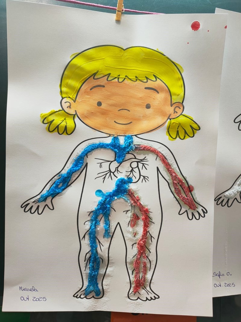 Relativamente ao sistema circulatório, aplicaram cola branca e sal e realizaram a técnica de “tinta mágica”, recriando de forma criativa o sangue a circular nos vasos sanguíneos.